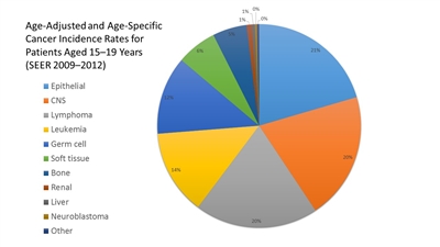 - The Children's Oncology Group (COG) has opted to define rare pediatric cancers as those listed in the International Classification of Childhood Cancer subgroup XI, which includes thyroid cancer, melanoma and nonmelanoma skin cancers, and multiple types of carcinomas (e.g., adrenocortical carcinoma, nasopharyngeal carcinoma, and most adult-type carcinomas such as breast cancer, colorectal cancer, etc.).[6] These diagnoses account for about 4% of cancers diagnosed in children aged 0 to 14 years, compared with about 20% of cancers diagnosed in adolescents aged 15 to 19 years (refer to Figures 1 and 2).[7] Most cancers within subgroup XI are either melanomas or thyroid cancer, with the remaining subgroup XI cancer types accounting for only 1.3% of cancers in children aged 0 to 14 years and 5.3% of cancers in adolescents aged 15 to 19 years.