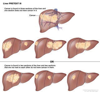 Liver PRETEXT II. Cancer is found in one or two sections of the liver. Two sections of the liver that are next to each other do not have cancer in them.