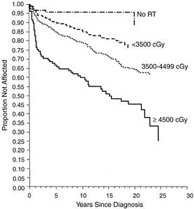 Recognition of late effects, concurrent with advances in cancer biology, radiological sciences, and supportive care, has resulted in a change in the prevalence and spectrum of treatment effects. In an effort to reduce and prevent late effects, contemporary therapy for most pediatric malignancies has evolved to a risk-adapted approach that is assigned based on a variety of clinical, biological, and sometimes genetic factors. The CCSS reported that with decreased cumulative dose and frequency of therapeutic radiation use over treatment decades from 1970 to 1999, survivors have experienced a significant decrease in risk of subsequent neoplasms.[20] With the exception of survivors requiring intensive multimodality therapy, sometimes including hematopoietic cell transplantation, for aggressive or refractory/relapsed malignancies, life-threatening treatment effects are relatively uncommon after contemporary therapy in early follow-up (up to 10 years after diagnosis). However, survivors still frequently experience life-altering morbidity related to effects of cancer treatment on endocrine, reproductive, musculoskeletal, and neurologic function.